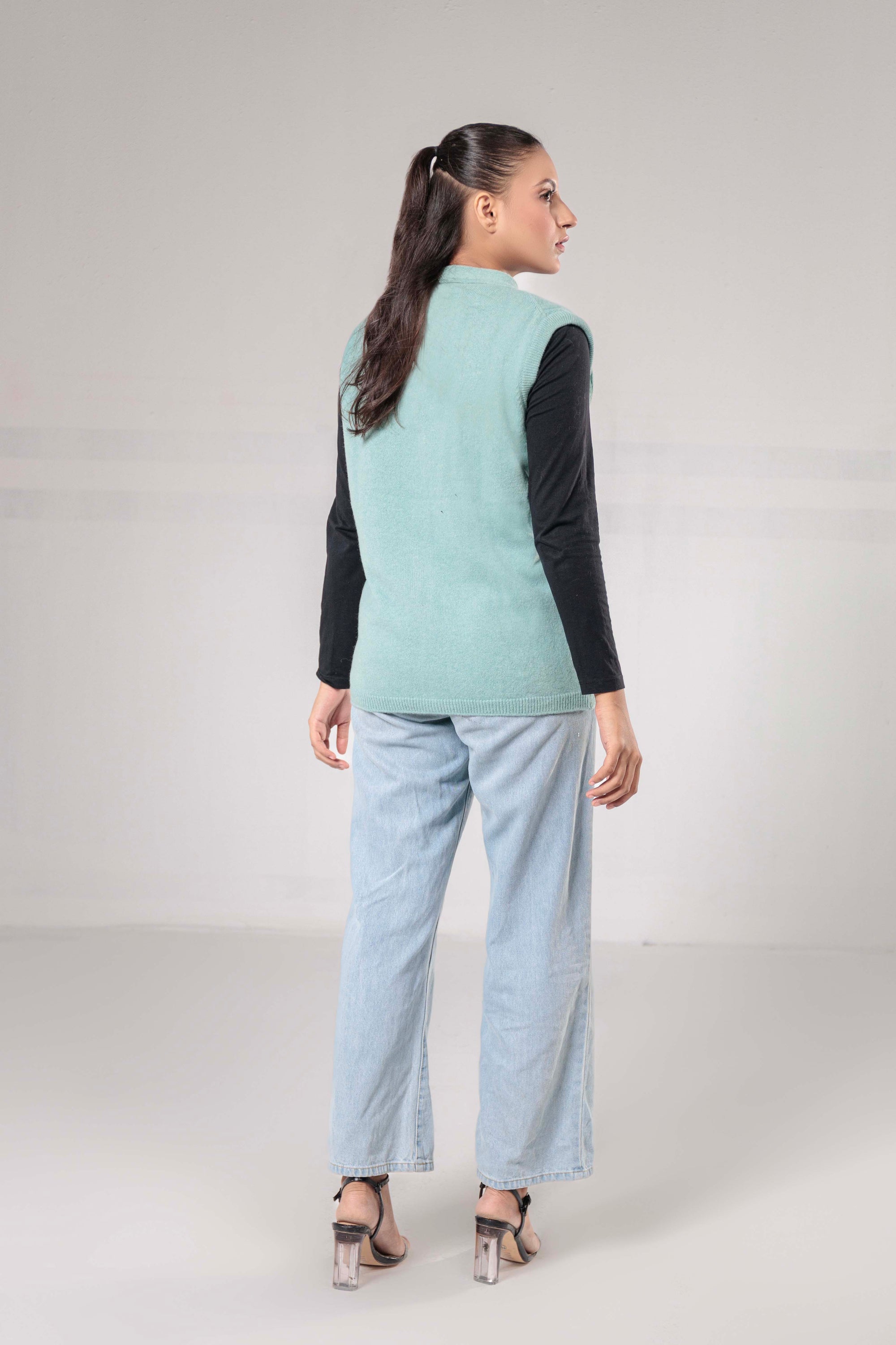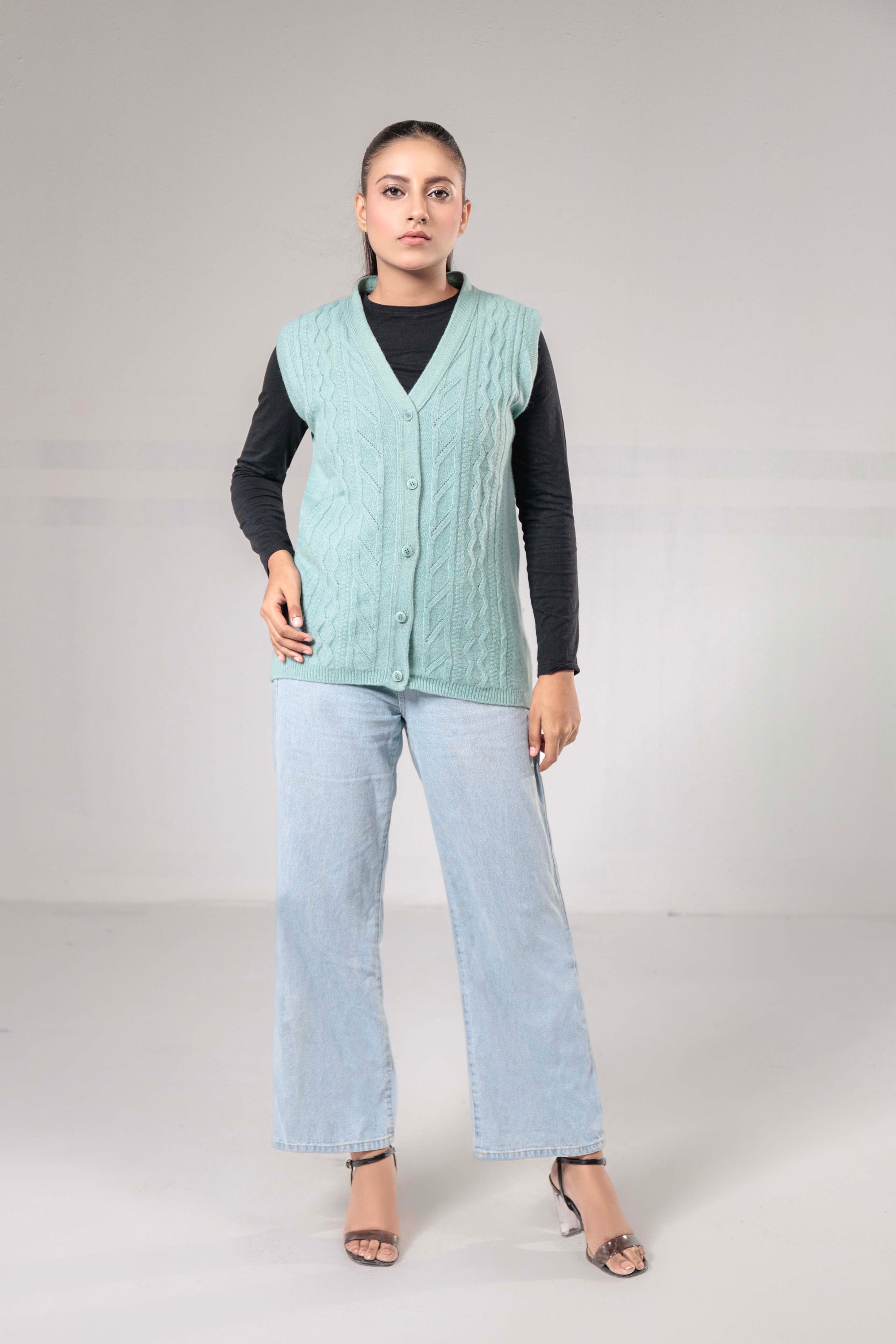 100% Lambswool Sleeve Less Cardigan